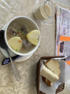 トクマクのバスターミナルに到着し、ショルポとミルクティーでブランチ。