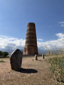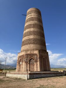 チケットは入り口のスタッフのおばちゃんから買う。「帰りのマルシュは35〜40分おきに来るから」と教えてくれたが、実際には11:00から1時間以上待っても来なかった。塔は草原の中にぽつんと立っていて、こんな場所に何百年も残り続けていると思うと感慨深い。螺旋状の階段は狭くて急で暗く、相互通行は無理なほど。上に登ると風が気持ちよく、辺りを一望できた。良い日差しの中、キルギスの平野を一人占め。