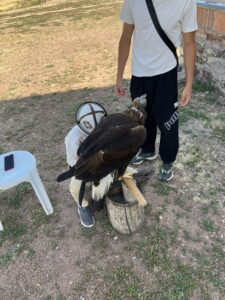 下では観光客向けにイヌワシとの写真撮影があり、兄弟2人がスタッフをしていた。200ソム。値引き交渉はせずそのまま体験。たまたま周りに観光客がいなかったのでたくさん写真を撮ってもらい、イヌワシの目のカバーを外して触らせてもらうこともできた。体重は5kg以上あり、大きな体と鋭い口ばし、眼光がとにかくかっこいい。中央アジアならではの貴重な体験で嬉しかった!