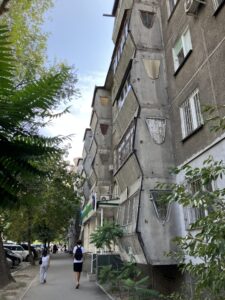 朝、ビシュケクの街をバス停まで歩く。おそらく旧ソ連時代に建てられたであろう無機質な集合住宅を横目に進む。建物は無機質なんだけど、よく見るとアクセントがあったり、格子のデザインが修理した時期によって違っていたりして味がある。こういう変わったデザインを見つけるのが楽しい。市バスに乗り(途中ビシュケク・セントラルモスクが見えた)、ビシュケク西バスターミナルへ。