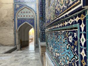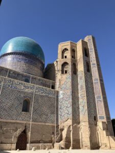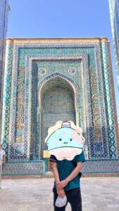 朝一番に行った Shoh-i-Zinda – シャー=イ=ズィンダ霊廟群 に向かう。朝とは太陽の向きが異なるので、またちがった景色を楽しむことができた。絵の解説をガイドさんにしてもらう。アラビア語の文字、イスラムのデザイン、アフガニスタン風の絵、アゼルバイジャン方式の建物など、各地域や国からシルクロードを経てサマルカンドに集まっていて面白い。自分一人ではわからないところまでたくさん教えてもらえた。