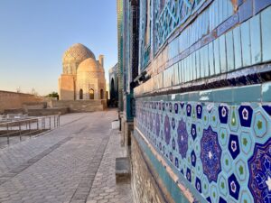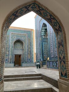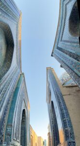 1つ目の Shoh-i-Zinda – シャー=イ=ズィンダ霊廟群 にたどり着く。ものすごい「あお」。あおという漢字を探しても2つほどの「青」や「碧」しかわからないが、この水色の「あお」は清流のようなもっと澄みきった青であった。