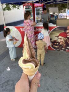 暑いので、露店でソフトクリームを注文する。デフォルトがチョコとのミックスで約50円だった。甘くて冷たくておいしい。赤ちゃん猫とすれちがう。こういった路地も歩きながら次は寺院へ向かう。トイレにパットは入れないので、モスクで借りる。こちらのモスクは内部の星の紋章が美しい。また、黒い棺が重厚感と存在感を放っていた。厳かな雰囲気を味わうことができる。