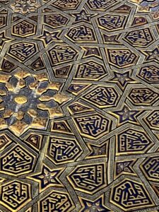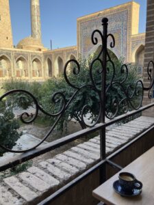 Registon Maydoni – レギスタン広場(三大マドラサ) へ向かう。これは神学校であり、それぞれ違うタイミングで順に建てられたそうだ。1つの校舎はコーヒーショップになっているそうなので、一息つく。神学校だった建物は金がふんだんに使われており、ヨーロッパやタイなどほかの地域とはちがった雰囲気でおもしろい。
