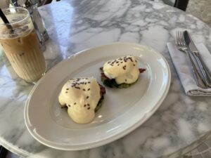 やはり充電がないので、近くのホテル併設の高級カフェに入る。アイスコーヒー400円とエッグベネディクト1050円を頼む。物価を考えると、現地の3倍くらいかと思うが、味も良かったので正解だった。ソフトクリームが50円の世界線で高級すぎるが、休憩なので良しとしよう。