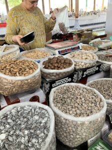 つづけてバザールに向かう。ナッツやはちみつを試食させてもらう。この先も旅が長いので、多くは買えず残念だったが、ナッツを少量購入する。