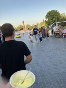 少しずつ気温が落ち着いてきた。広場の外から何やらにぎやかな声がすると思うと、小さなサーカスが催されていた。地元の子どもたちが目をキラキラさせて見ていてほっこりする。10分ほど見させてもらい、優しかったガイドさんと別れる。晩御飯に困ったが、1日中見続けてきたサマルカンドのパン(直径30センチ)を買ってホテルに向かう。