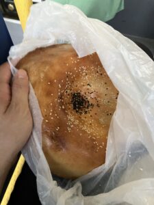 昨日は機内泊のため、スマホの充電をしたい。朝ごはんもかねて、超ローカルの店に入る。テーブルは4席の小さいお店で、2人のお姉さんはウズベク語オンリー。なんとかマントゥーとコーラを注文。途中おじさんが買っていった揚げパンも指差し注文。女性2人は友だちだそうで、ウズベク語、ロシア語、英語ほとんどボディーランゲージで会話。「結婚しているの?」とウズベク語で聞かれた気がしたので、薬指を見せながら英語で「結婚していないよ」と答えると、お互いに笑いあって会話がつながった。楽しいひとときだ。ウズベキスタンの人はみんな親切である。マントゥーと揚げパン、コーラ2本で約300円を払う。