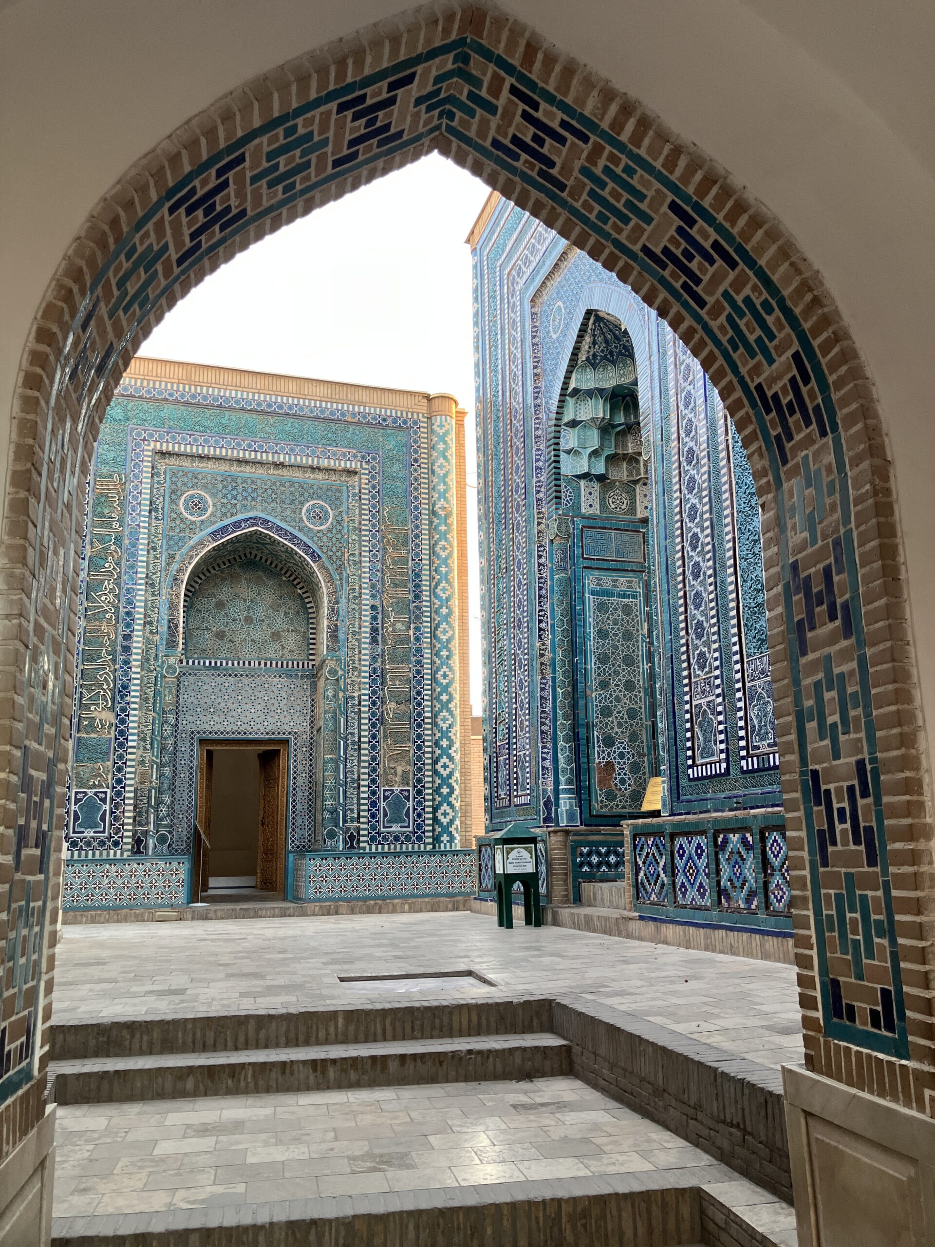 1つ目の Shoh-i-Zinda – シャー=イ=ズィンダ霊廟群 にたどり着く。ものすごい「あお」。あおという漢字を探しても2つほどの「青」や「碧」しかわからないが、この水色の「あお」は清流のようなもっと澄みきった青であった。