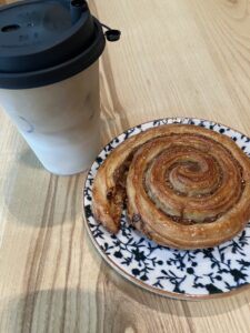 首都の一等地のカフェはおしゃれ。パンとアイスラテを頂く。