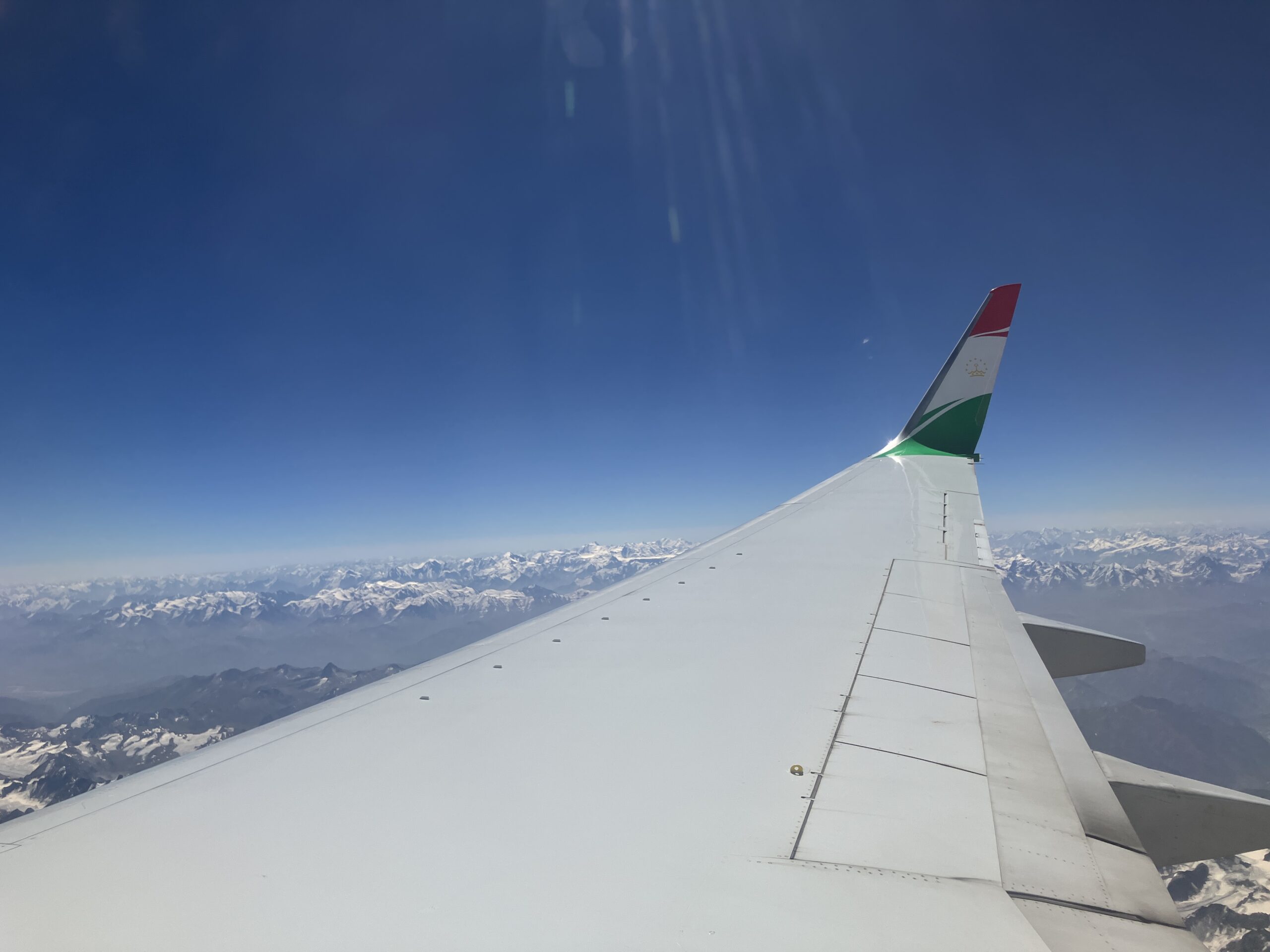 無事乗り込みキルギスの首都ビシュケクまではタジキスタンの首都ドゥシャンベから1時間半のフライト。時差は+1時間。キルギスとタジキスタンの国境(厳密には揉めてて定まっていない)上空を飛ぶ。5500mを超える山々は険しく、万年の雪が残っている。